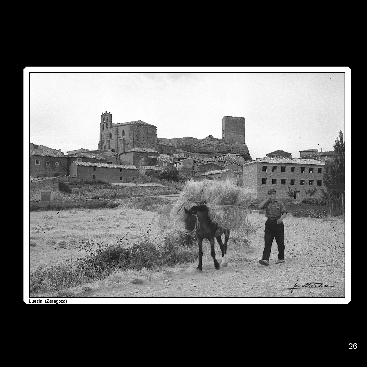 Todos estos elementos de Luesia están presentes en la fotografía que captó el genial José Antonio Duce para su serie “Aragón en mi recuerdo”, sumando la presencia de un labrador con su mulo cargado de paja; una escena que cualquier caminante ha podido presenciar desde la fundación del pueblo hasta la actualidad y que así une y resume siglos de historia de la villa. En esta estampa, solo el edificio moderno de la derecha y la ropa del hombre permiten datar la imagen en el siglo XX.