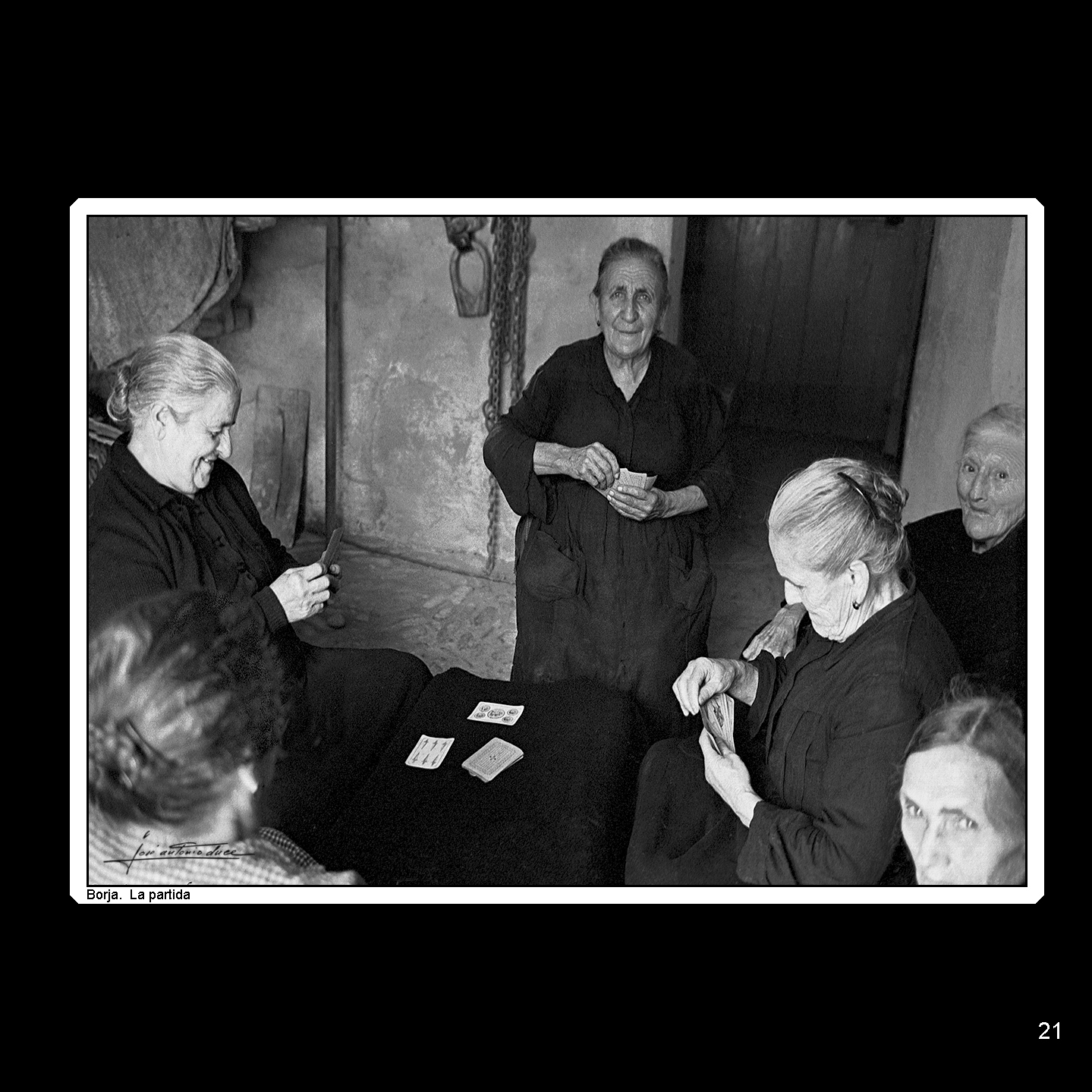 El título de la foto nos informa que la imagen se captó en Borja, pero cualquier espectador de más de cuarenta años recordará haber visto esta misma escena muchas veces: una casa de pueblo en la que un grupo de mujeres -siempre de negro, con el pelo peinado en un moño- entretenían la tarde con largas partidas de cartas, parece que aquí de brisca.