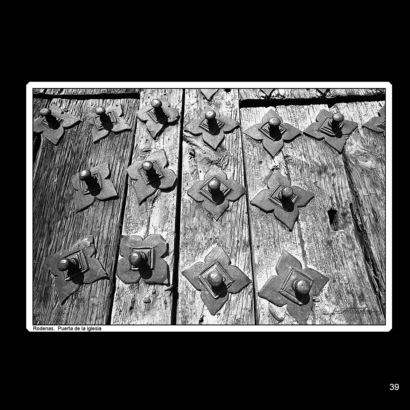 Una simple puerta, se podría decir; aunque los clavos que la adornan muestran que se trata de un edificio destacado y el título de la foto, que normalmente suele ser solo el del pueblo donde se tomó la imagen, nos concreta que es la puerta de la iglesia. Pero no estamos ni mucho menos frente a un monumento; por el contrario, el gran fotógrafo lo que nos transmite aquí es toda la belleza y cualidades que se esconden en unos materiales sencillos, de factura artesana.