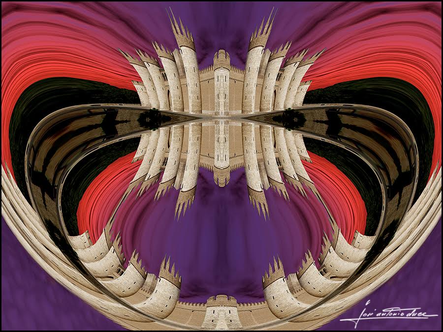 Pórtico de esta serie es esta singular visión calideoscópica del conjunto, que aparte de su belleza formal sugiere también los fines señalados. La composición circular puede recordarnos a un ojo, un ojo nuevo y artístico para ver la Aljafería.